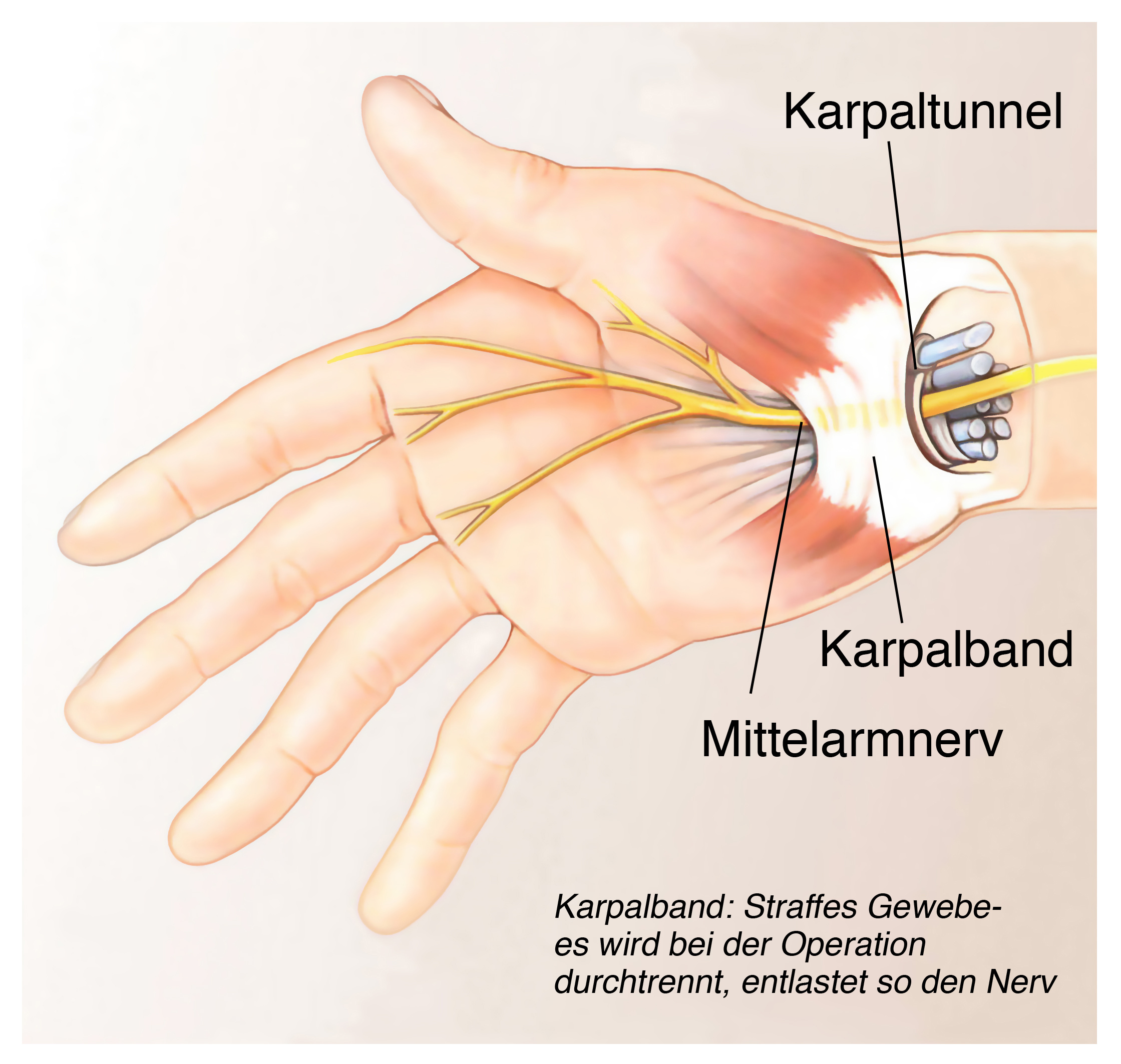 Der Karpaltunnel ist eine Knochenbandstruktur im Bereich der Handfläche. Hier laufen die Beugesehnen und der Medianus-Nerv der Hand hindurch. Durch eine Enge des Kanals kann es zu Schmerzen und Gefühlsstörungen am Nerv kommen. Sollten sie trotz bereits durchgeführten nichtoperativen Maßnahmen keine Verbesserung verspüren, besteht die Notwendigkeit eines Eingriffs. Der Bandanteil des Karpaltunnels wird hierbei gespalten und der Nerv bekommt wieder den benötigten Platz.