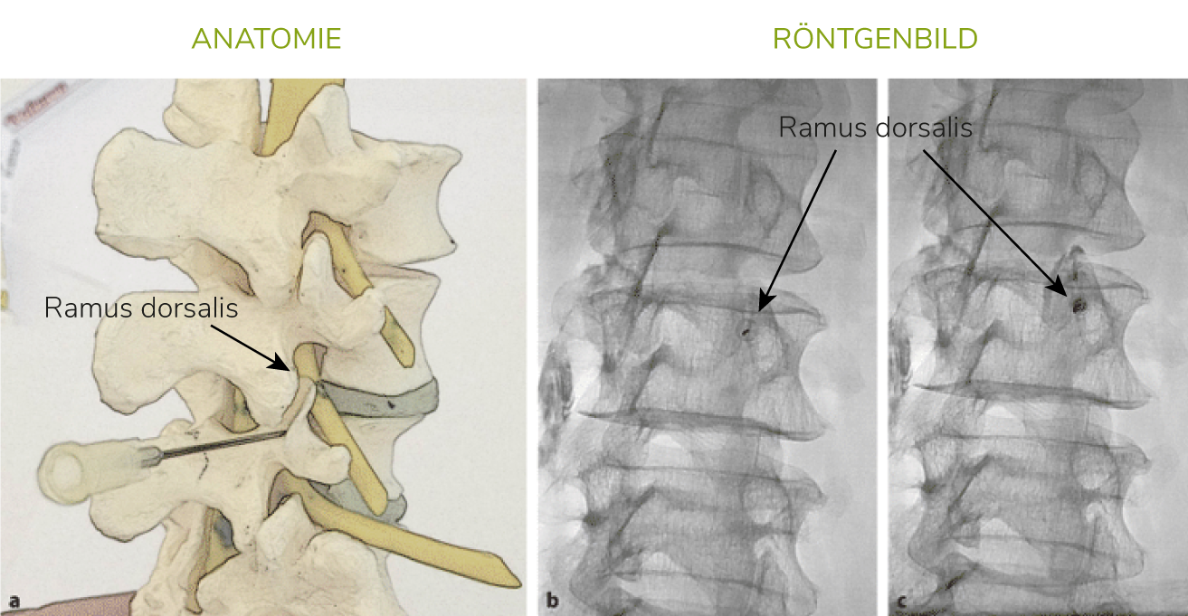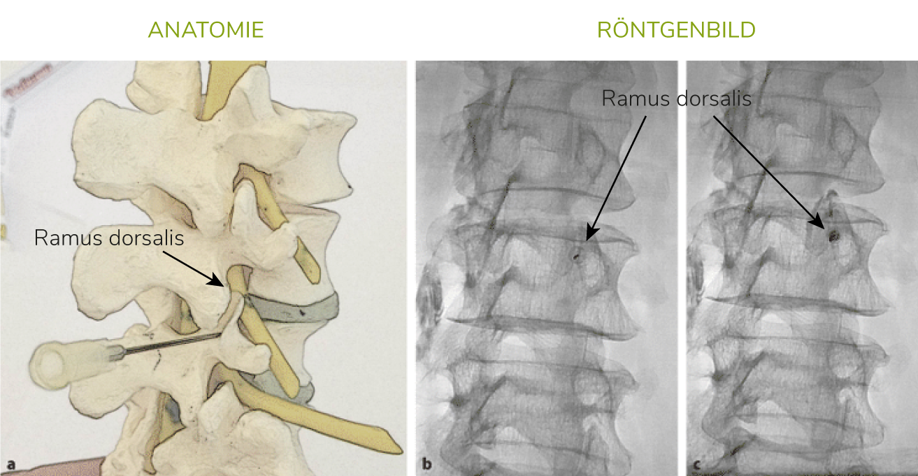 Der sogenannte Ramus dorsalis ist ein Nerv, der an den kleinen Wirbelgelenken nur eine einzige und damit für uns Menschen eine sehr Lebensqualität beeinträchtigende Funktion hat: Die Weiterleitung von Schmerzen. Diesen Nerv kann an einer knöchern markanten Stelle unter Durchleuchtungskontrolle sehr gut aufgesucht werden. Durch ein lokal verabreichtes kurz und länger wirksames Betäubungsmittel wird festgestellt, ob dieser Nerv für den Schmerz verantwortlich zeichnet. Die Linderung tritt innerhalb von 5-15 Minuten ein und hält bis zu drei Stunden. Gelingt die Schmerzausschaltung zwei Mal innerhalb von zwei getrennten Behandlungssitzungen um wenigstens 50%, so ist man nach derzeit gültigen Leitlinien einig, dass eine sog. Facettendenervation hilfreich ist. Bei diesem Verfahren wird dieser Nerv mit einer Thermosonde aufgesucht, nach vorheriger Betäubung auf 80° C erhitzt und somit die dauernde Schmerzweiterleitung verhindert. Dieses Verfahren wird Facettendenervierung oder auch Facettendenervation genannt. Das Verfahren wird bei uns in der Praxis ambulant durchgeführt und zeichnet sich durch eine sehr geringe Nebenwirkungsrate aus. Diese sind z.B. leichte Schmerzen an der Einstichstelle, ein bis zwei Tage andauernde geringe Schmerzen bei Bewegung, die mit einfachen Medikamenten wie beispielsweise Diclofenac oder Ibuprofen gelindert werden können.